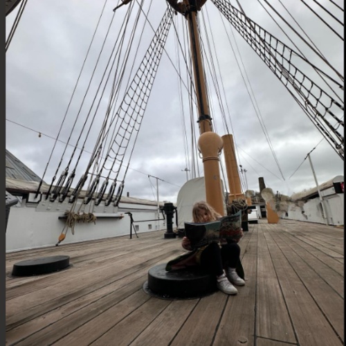 Her smile on the gate is a welcoming sight, now she's reading a tale with some Turkish delight!