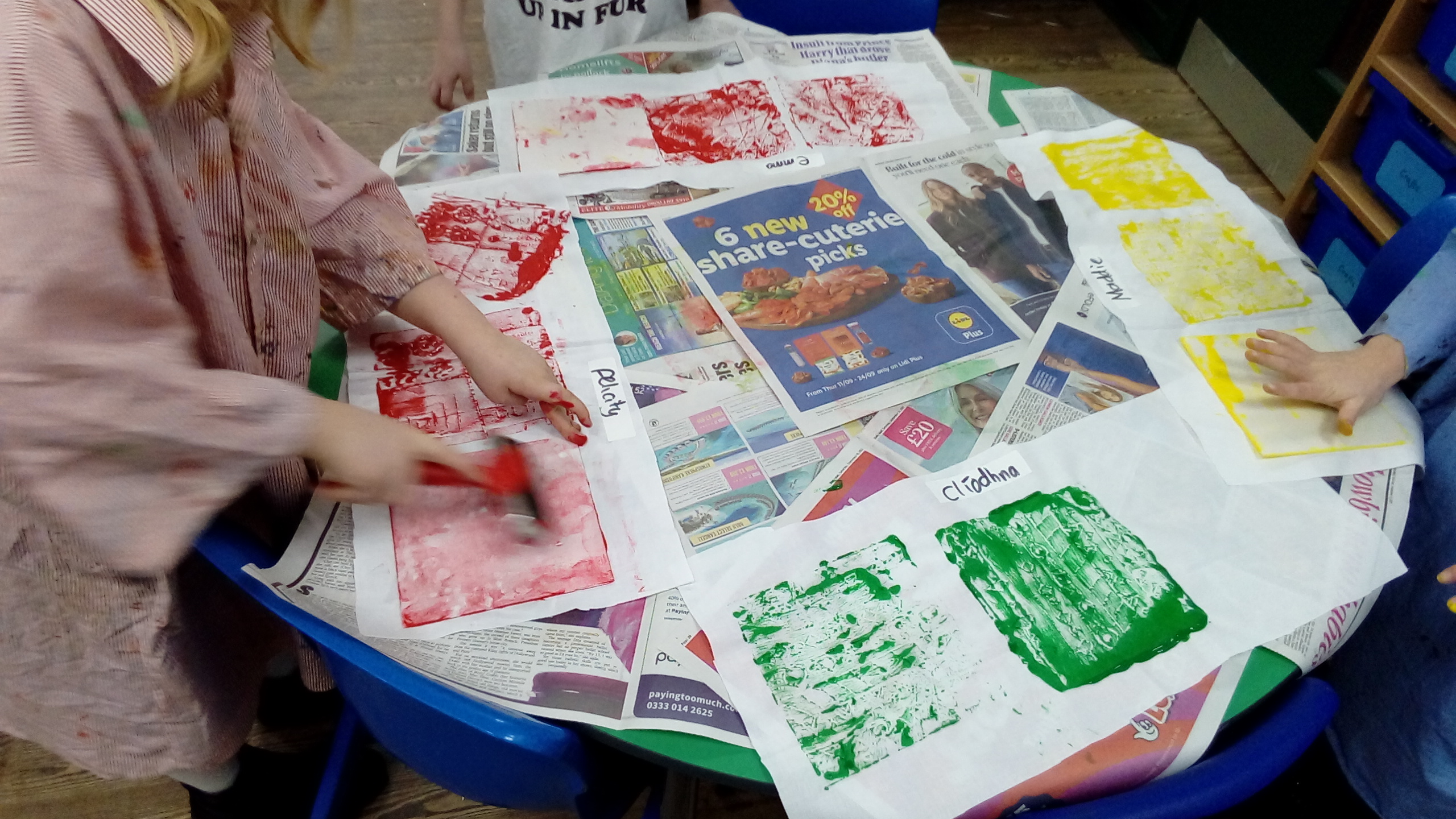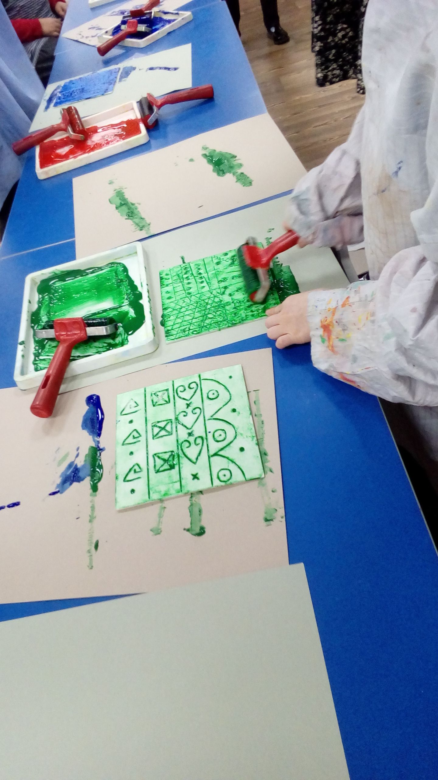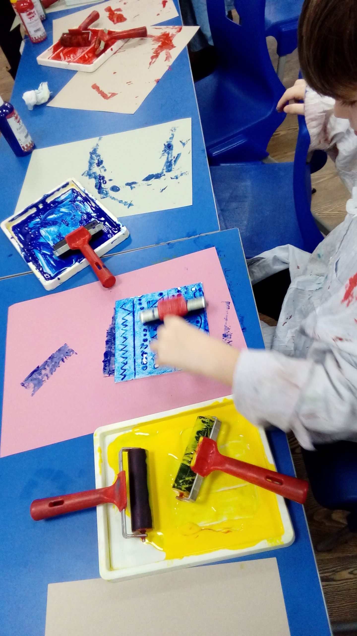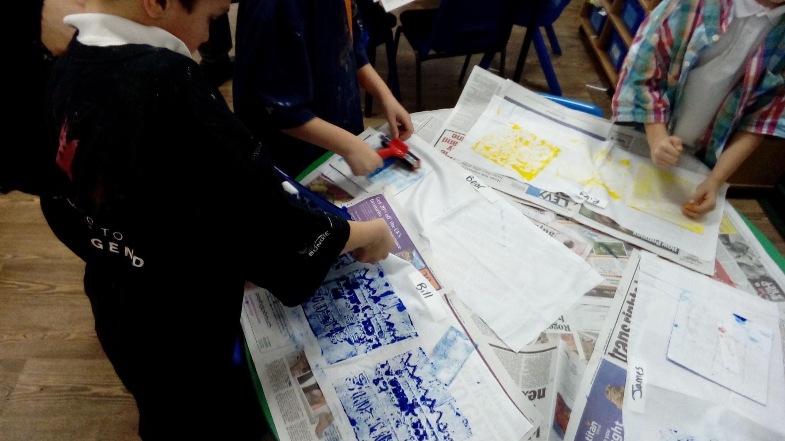 The children enjoyed creating their own African-inspired prints using geometric patterns and symbols. They created their patterns, then transferred them onto a polystyrene tile, and then chose their own colour of fabric paint. They then printed their pattern onto their material. They were very excited to see their patterns appear, and can't wait to make this material into a bag.
