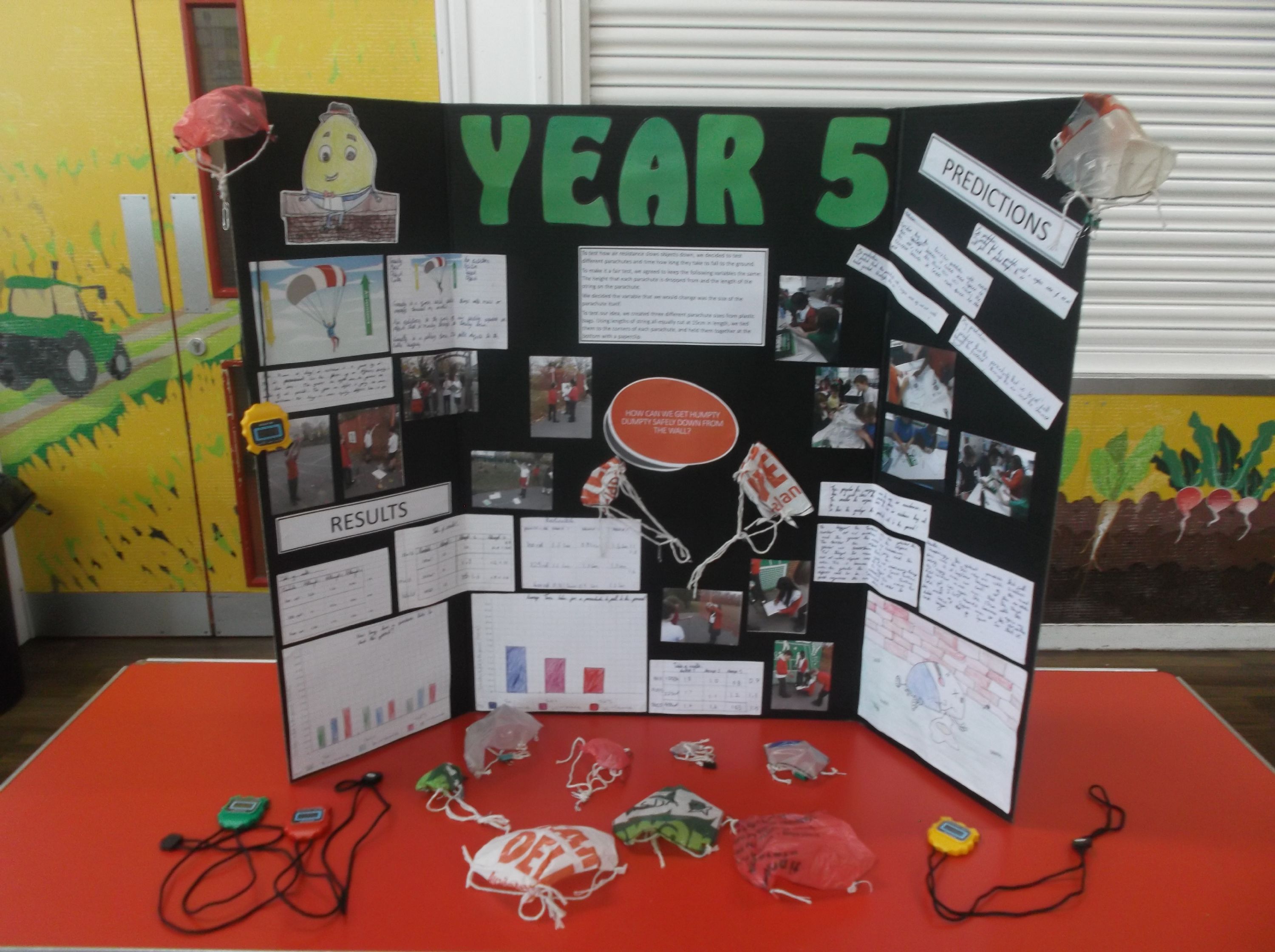 During science week, the children were all set the task of working out how best they could help get Humpty Dumpty safely down off of the wall! They explored the effects of gravity, and learnt about air resistance, and designed a series of parachutes, all of different sizes to see how they would affect Humpty's descent. The children all recorded their times and analysed their data in the form of bar charts, coming to the conclusion that the larger the surface area of the parachute, the greater the air resistance. This meant that a big parachute could hopefully save Humpty Dumpty!