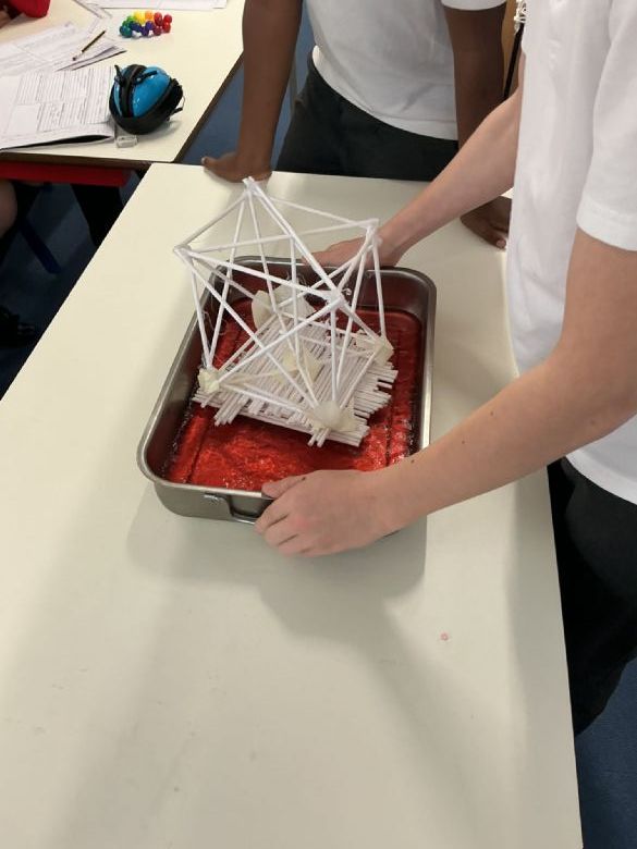 Once our structures were complete, we then tested the structures out! We used a tray of jelly to represent the crust of the Earth, and placed our structures on them and shook the tray to see if our designs would collapse. Thankfully, most of our designs were able to withstand the earthquake, much to our excitement and delight!