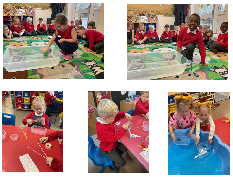 We spent time testing lots of different materials to see which ones floated and which ones sank. The children loved making predictions and then watching to see if they were right. After lots of splashing and experimenting, we found out that plastic floated best, so that became our top choice for Incy Wincy’s boat.