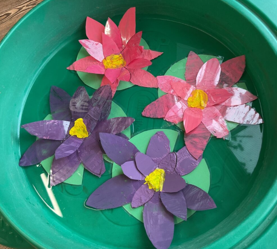 During Art week, Year R studied the works of Monet, looking at his paintings of water lillies. They had first experience of lily pads from Mrs Doherty's auntie's pond, exploring what they looked and felt like. They looked at lots of different paintings, discussed the artists' style and had a go at recreating their own paintings using similar techniques. Later they practised their cutting skills by cutting pieces of plastic and working in groups to create 3D water lillies in groups, which actually floated! We hope all the grown ups enjoyed popping in to see their wonderful creations!